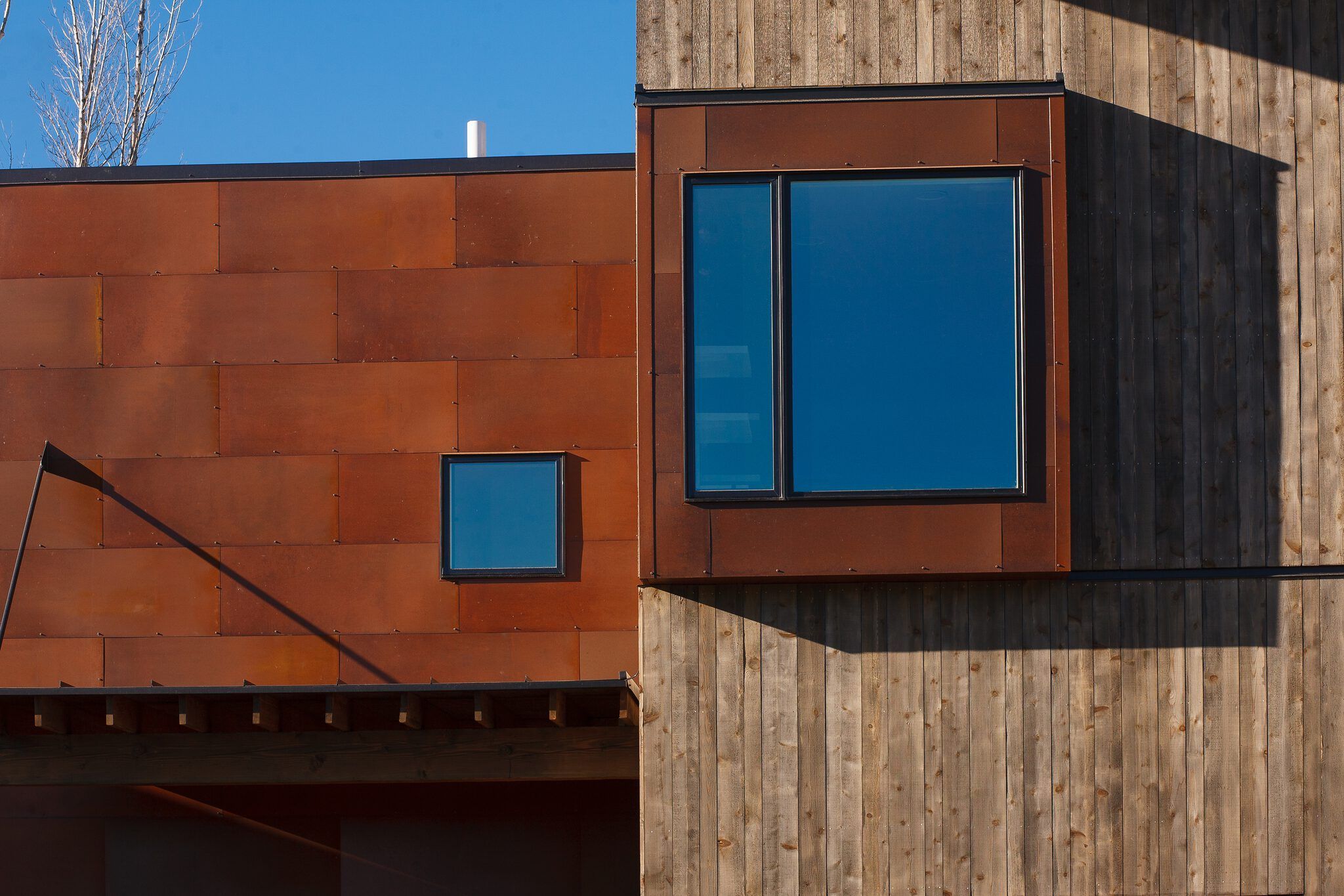 Vertical cedar siding, oxidized metal, standing seam metal roofing material and aluminum clad windows anchor the house in the context of its neighborhood. Each home has a ‘shed roof’ with a single, continuous pitch. This helped to keep the construction costs down while ensuring that all snow, ice, and rain will shed away from driveways and walkways.