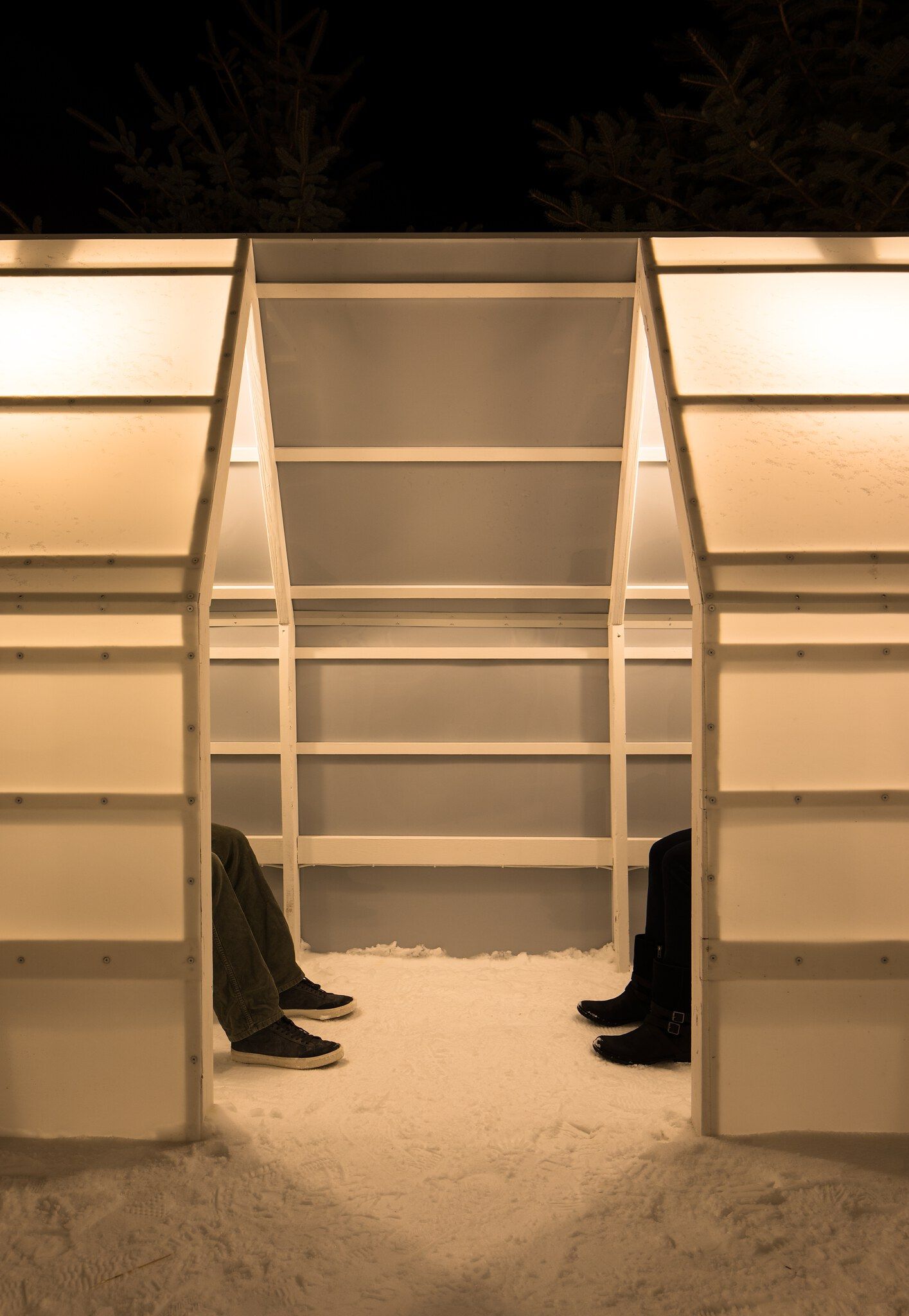 The conversation huts were again installed in Teton Village during the annual GLOW Nights Festival, and event that employs light as a medium to attract people out into public spaces at night. The structures were re-clad recycled HDPE panels to withstand the winter conditions and simple pendant lights were added to illuminate the spaces at night.