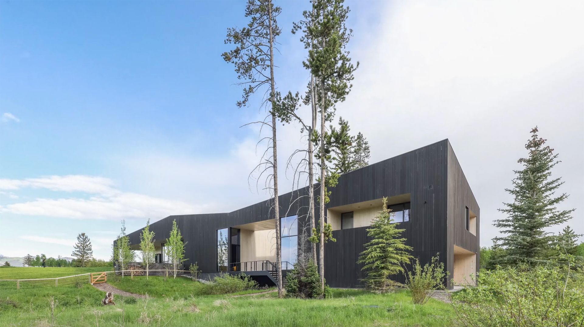 Throughout all buildings, the architecture is open, with sweeping views to mountain vistas of the Grand Tetons, natural fauna, forests, and meadows. Rectilinear in plan, the main house appears to grab surrounding trees as anchors, sinking in the center, and pulling upward toward the sky at the corners. Working in concert with the landscape, this dynamic quality is carried through the building’s charred shou sugi ban exterior, tugged and carved to create overhangs and openings. The wood exterior wraps into the interior as light Atlantic cedar, which then dissolves into subtle plaster and floor-to-ceiling glass.